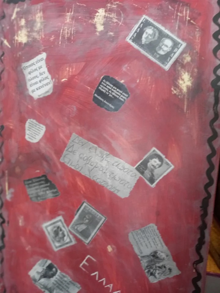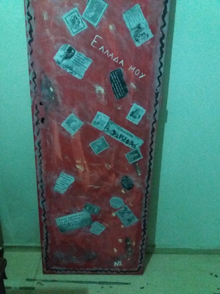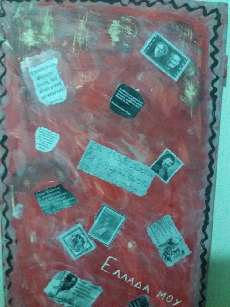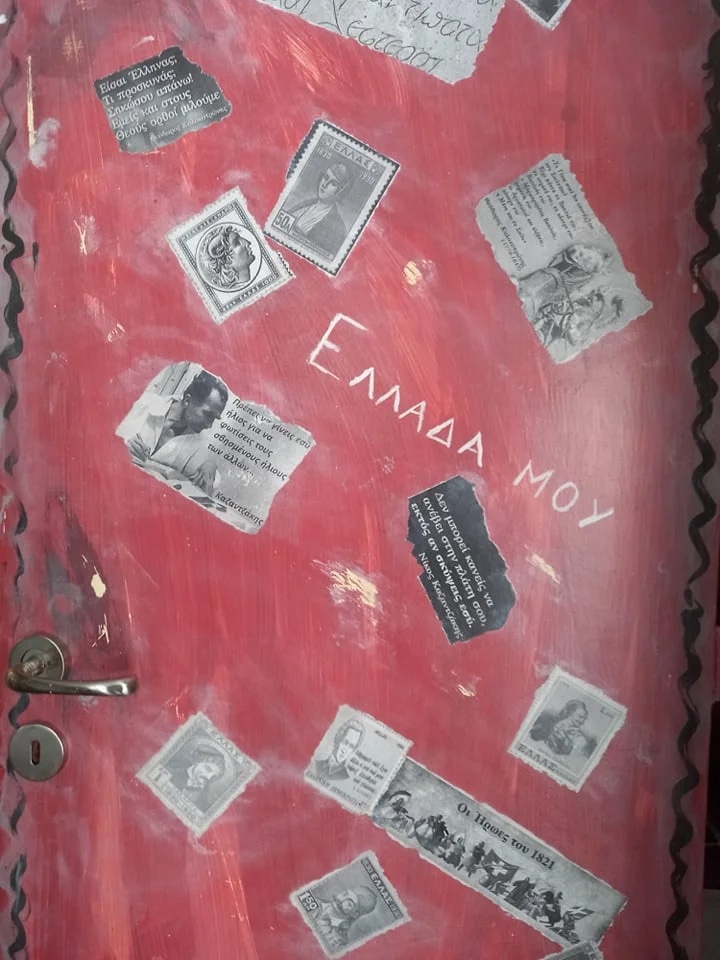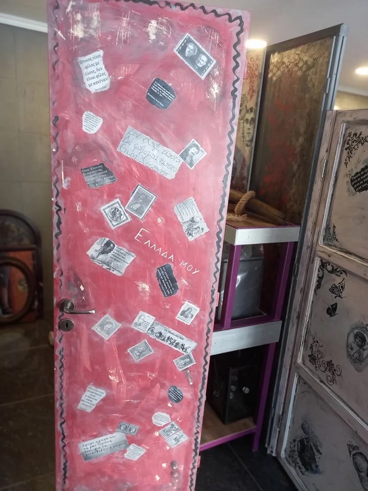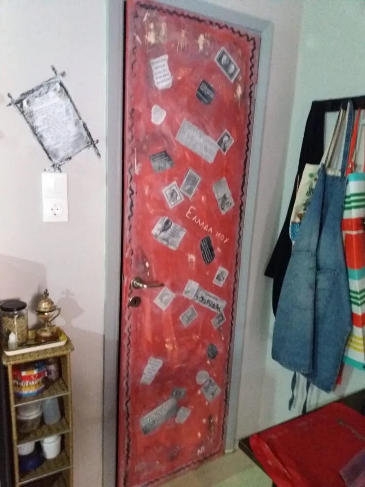 Κάνοντας την ανατροπή, τόλμησα και άρχισα το ντεκουπάζ βάζοντας επάνω στην κόκκινη πλέον πόρτα μας, ατάκες του Νίκου Καζαντζάκη, του Γιάννη Ρίτσου, γραμματόσημα με τους ήρωες της Ελληνικής Επανάστασης, φωτογραφίες τους, ατάκες που είχαν πει, ρητά Αρχαίων Ελλήνων, και στο τέλος κοιτάζοντας τη, δίχως να με νοιάζει σε ποιόν θα αρέσει και σε ποιόν όχι, με μάτια γεμάτα συγκίνηση πήρα το πινέλο και έγραψα επάνω της ” ΕΛΛΑΔΑ ΜΟΥ”…