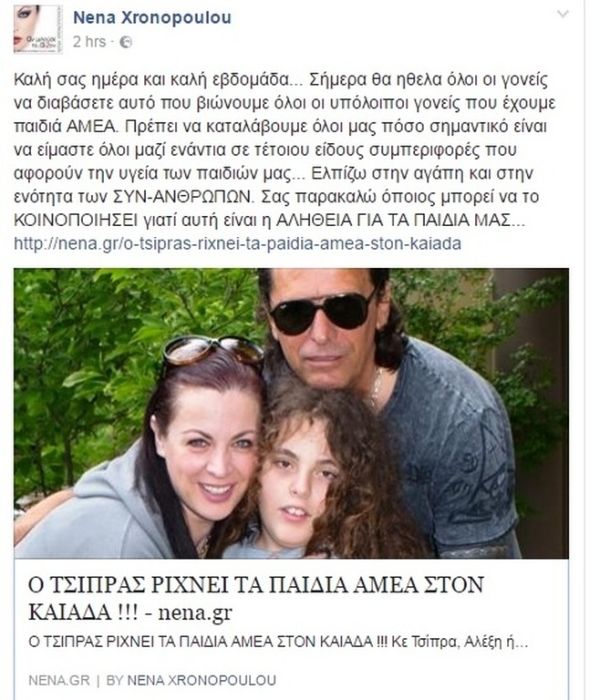 «Καλή σας ημέρα και καλή εβδομάδα… Σήμερα θα ήθελα όλοι οι γονείς να διαβάσετε αυτό που βιώνουμε όλοι οι υπόλοιποι γονείς που έχουμε παιδιά ΑΜΕΑ. Πρέπει να καταλάβουμε όλοι μας πόσο σημαντικό είναι να είμαστε όλοι μαζί ενάντια σε τέτοιου είδους συμπεριφορές που αφορούν την υγεία των παιδιών μας… Ελπίζω στην αγάπη και στην ενότητα των ΣΥΝ-ΑΝΘΡΩΠΩΝ. Σας παρακαλώ όποιος μπορεί να το ΚΟΙΝΟΠΟΙΗΣΕΙ γιατί αυτή είναι η ΑΛΗΘΕΙΑ ΓΙΑ ΤΑ ΠΑΙΔΙΑ ΜΑΣ…» έγραψε στο facebook και πόσταρε το άρθρο της.