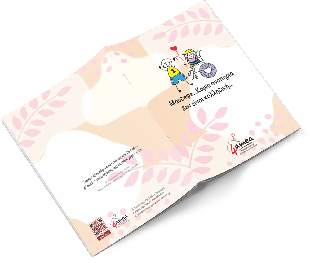 Το Πανελλαδικό Υποστηρικτικό & Κοινωνικό Δίκτυο 4amea, θέλει να προσφέρει σε όσους του προσφέρουν, και το κάθε απόκτημα σας να έχει ένα από τα μήνυμα “αποδοχής” και σεβασμού προς τους ανθρώπους με αναπηρία επάνω του έτσι ώστε να μας έχετε πάντα κοντά σας.