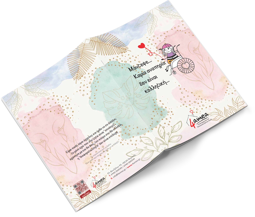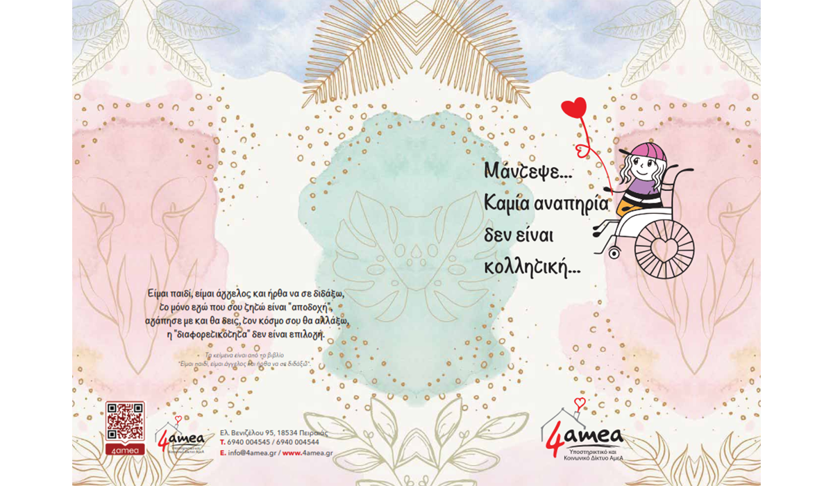 Το Πανελλαδικό Υποστηρικτικό & Κοινωνικό Δίκτυο 4amea, θέλει να προσφέρει σε όσους του προσφέρουν, και το κάθε απόκτημα σας να έχει ένα από τα μήνυμα “αποδοχής” και σεβασμού προς τους ανθρώπους με αναπηρία επάνω του έτσι ώστε να μας έχετε πάντα κοντά σας.